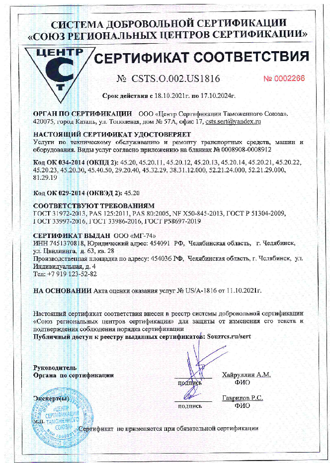 Сертификат соответствия на выполняемые работы ООО «МГ-74»