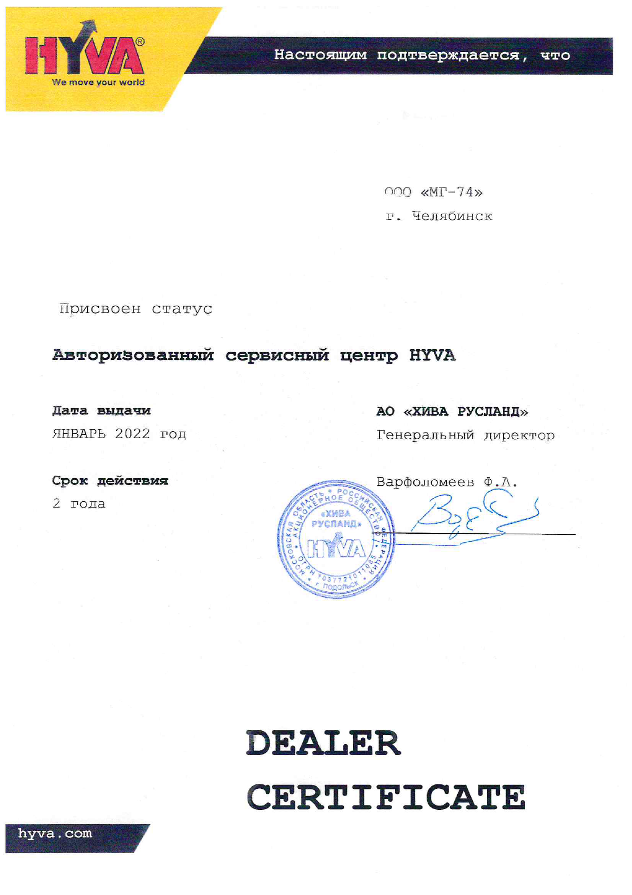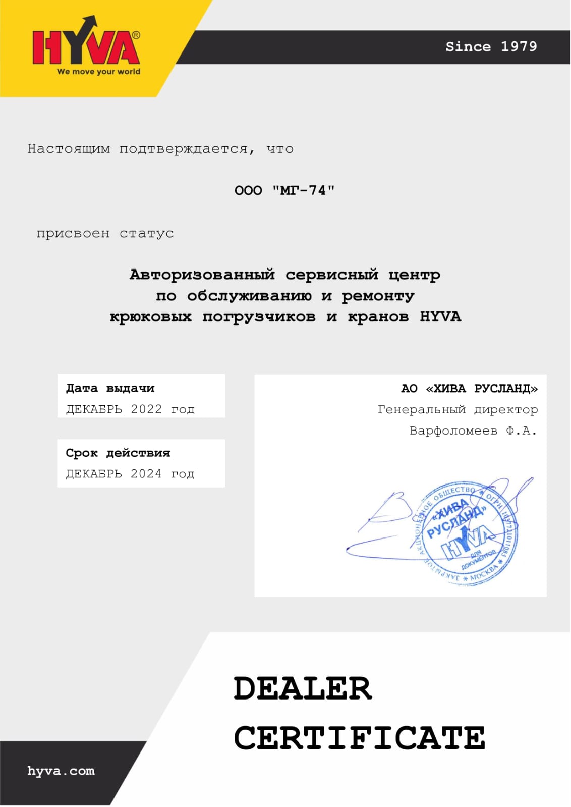 Сертификат «авторизованный сервис-центр» АО «ХИВА-Русланд» по обслуживанию HyvaCrane и HyvaLift