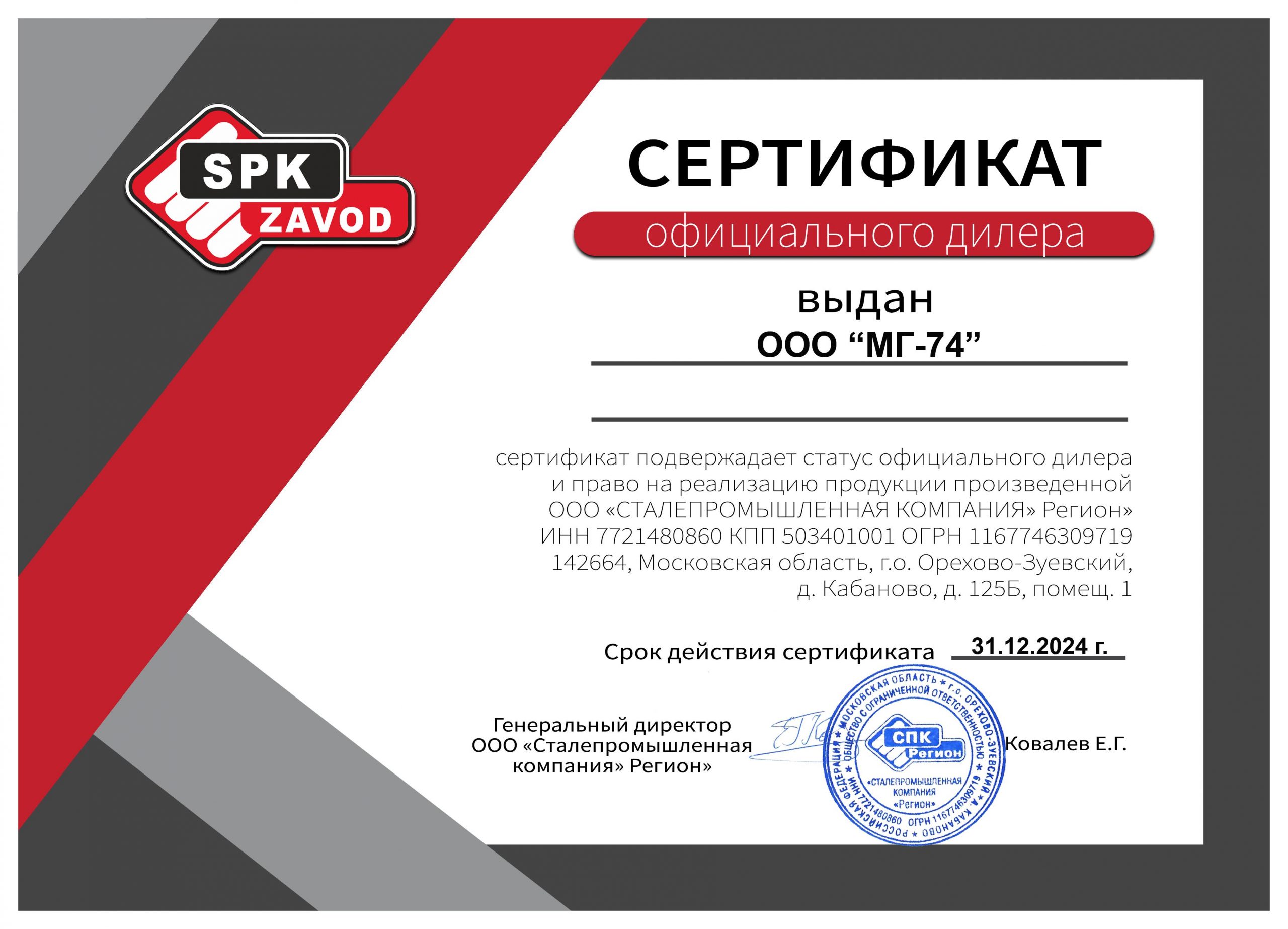 Сертификат официального дилера ООО «СТАЛЕПРОМЫШЛЕННАЯ КОМПАНИЯ» Регион»
