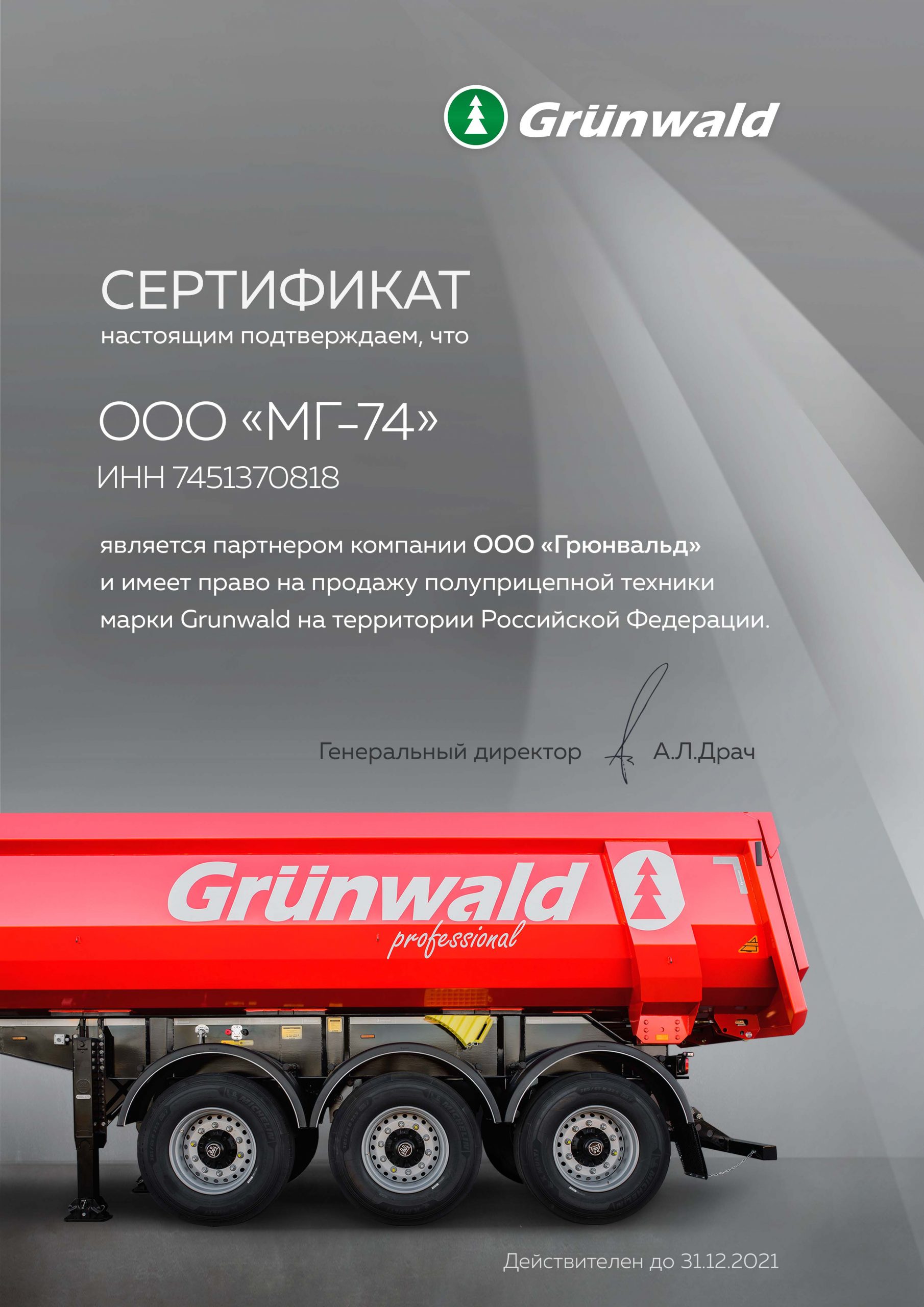 Сертификат дилера ООО «ГРЮНВАЛЬД»
