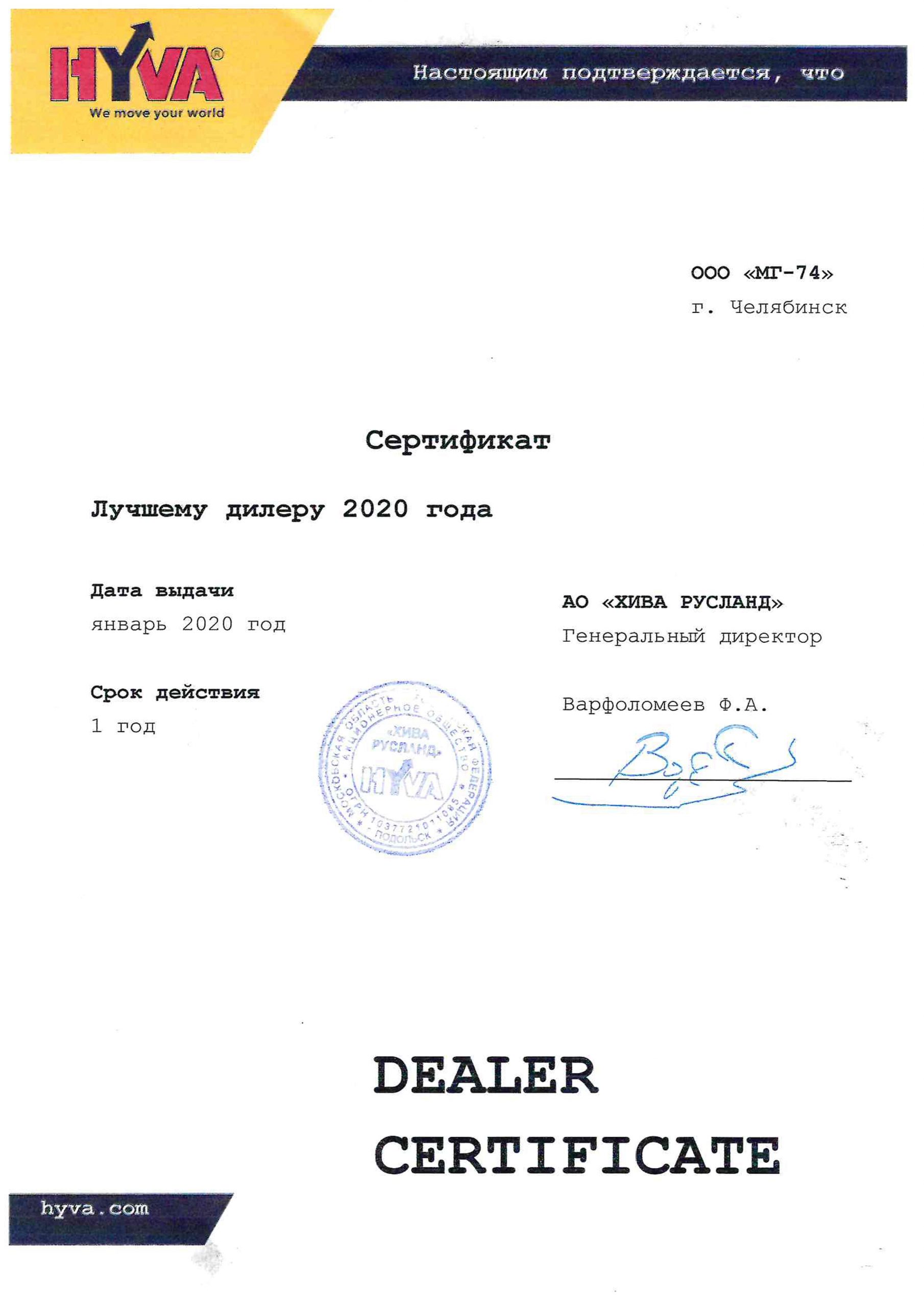 Сертификат «ЛУЧШЕМУ ДИЛЕРУ» 2020 г. АО «ХИВА-Русланд»