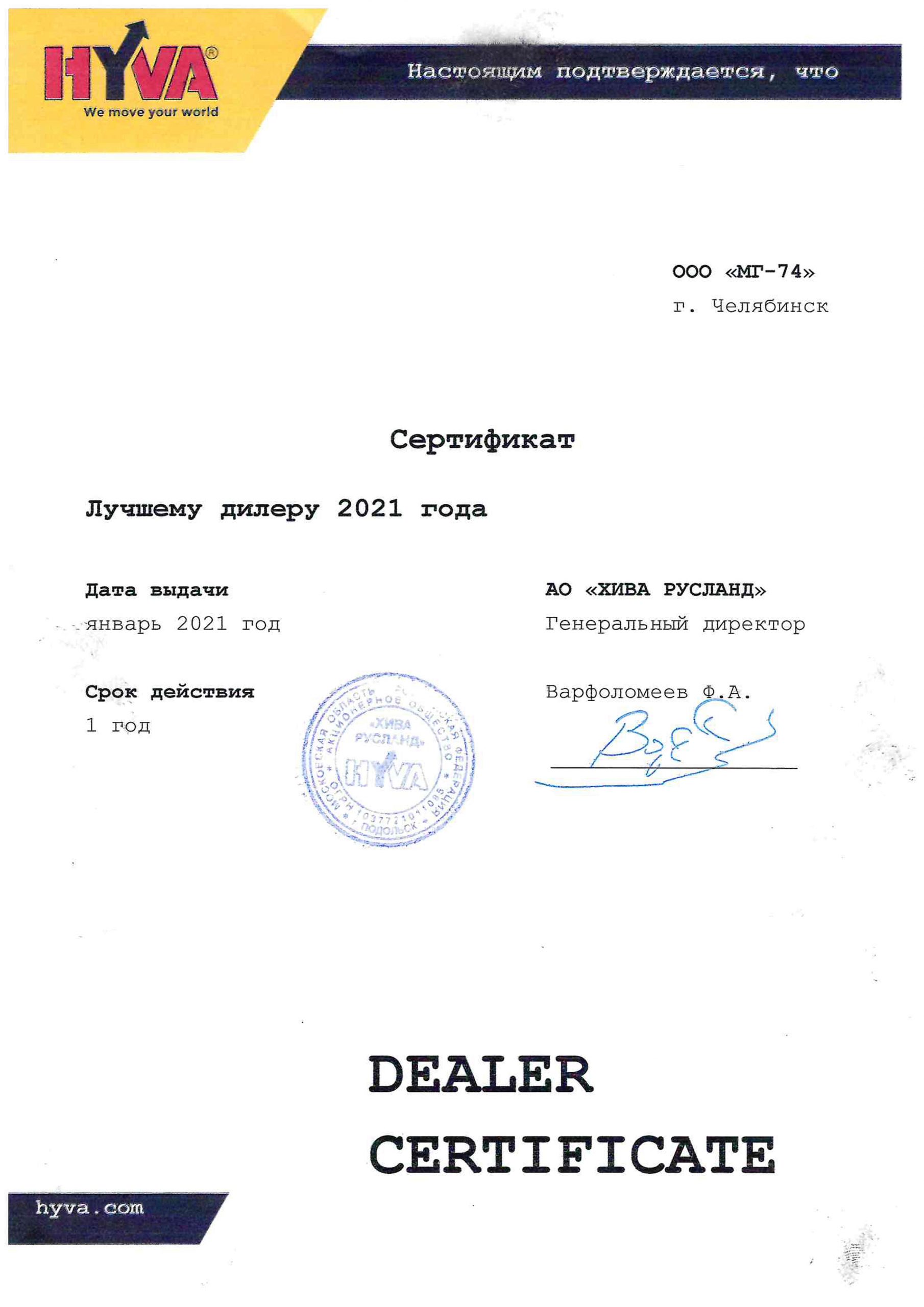 Сертификат «ЛУЧШЕМУ ДИЛЕРУ» 2021 г. АО «ХИВА-Русланд»